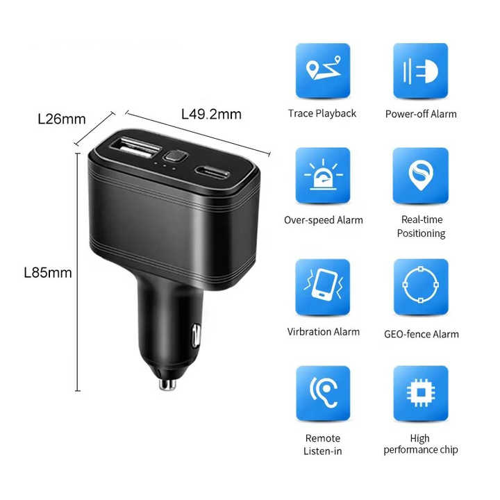 Real time tracking, Track playback, power off alarm, over speed alarm, vibration alarm, Geofence alarm, one way voice communication